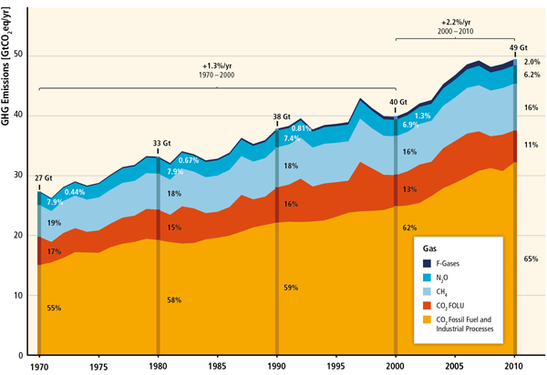 De årliga antropogena utsläppen av växthusgaser grupperade efter gaser 1970-2010. Källa: IPCC AR5 arbetsgrupp III