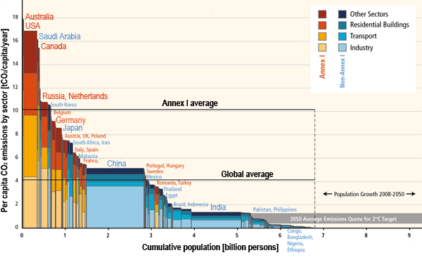 Utsläpp av koldioxid per capita och sektor 2008. Källa: IPCC AR5 arbetsgrupp III